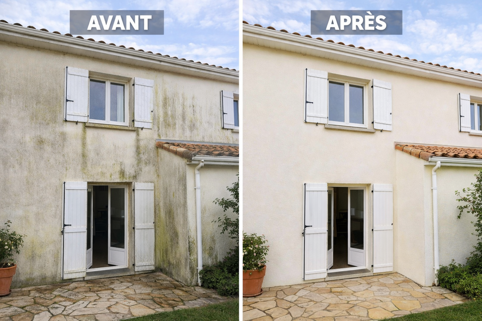 La rénovation de cette façade présentait un défi majeur : éliminer des marques de pollution tenaces et de l'encrassement biologique sans endommager le crépi délicat. Le changement est frappant : la façade a retrouvé sa propreté d'origine, améliorant considérablement l'esthétique générale de la propriété et augmentant sa valeur.
