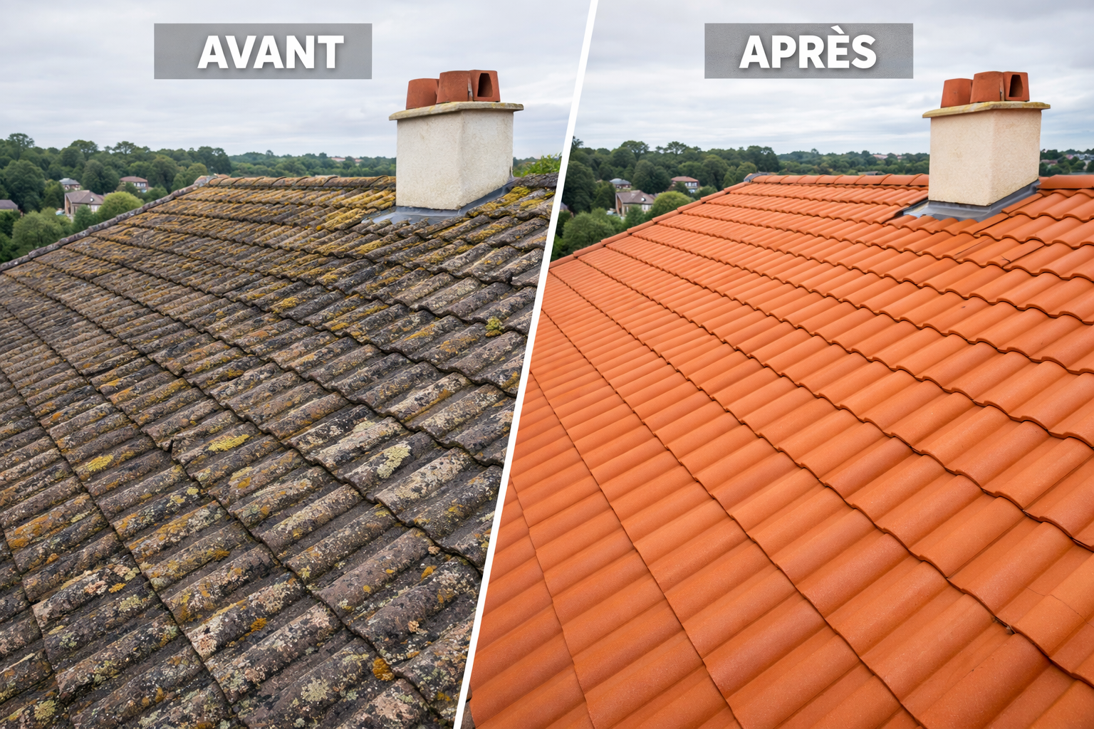 Pour ce projet de rénovation de toiture, le défi était double : non seulement éliminer une couche épaisse de mousse et de lichens qui menaçait l'intégrité des tuiles, mais aussi prévenir leur réapparition. Le résultat est une toiture saine, protégée et visuellement rajeunie, garantissant la longévité de la couverture.