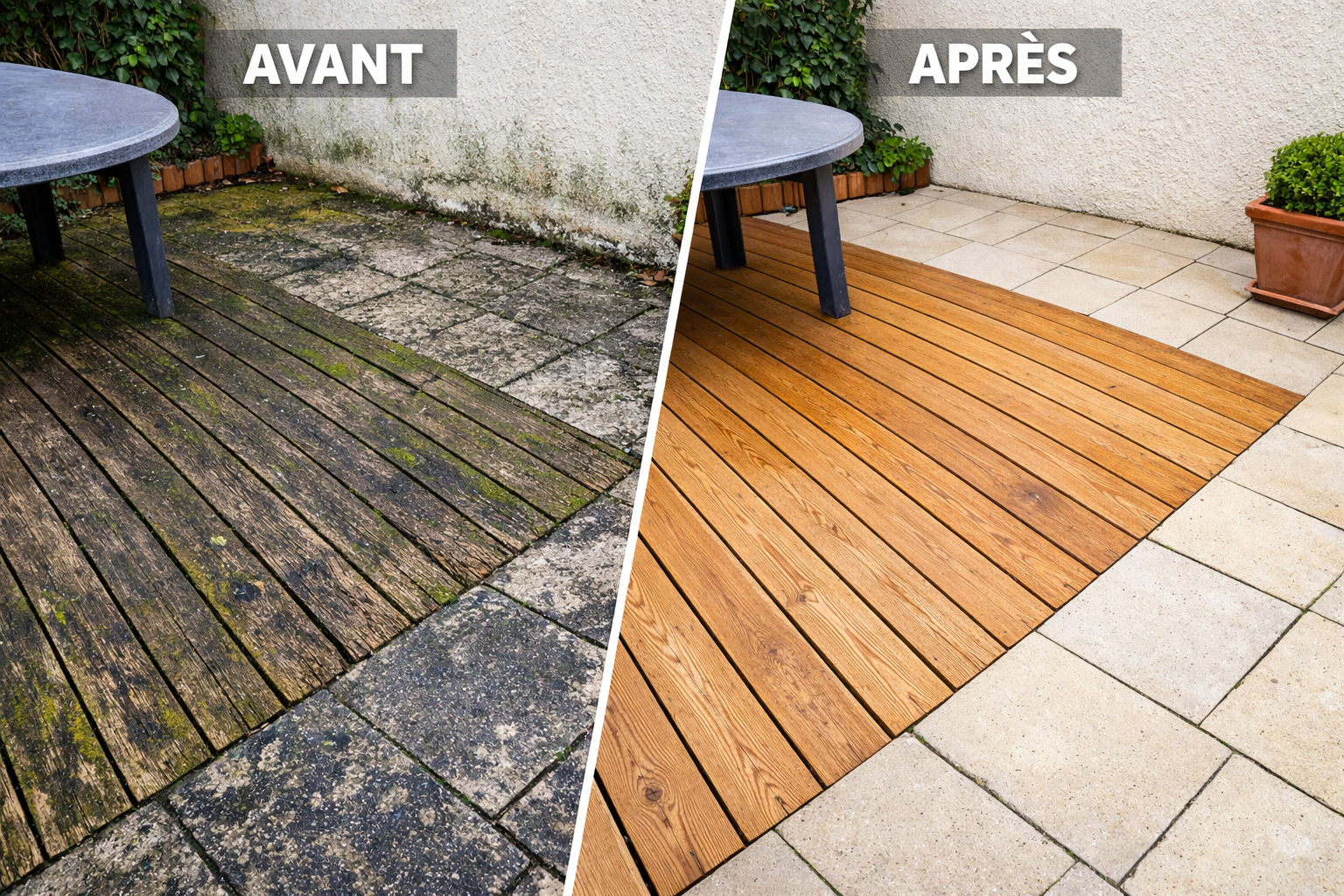 Ce projet de nettoyage de terrasse a redonné tout son éclat à un espace de vie extérieur fortement altéré par des années d'intempéries et de dépôts verdâtres. Le défi principal était de préserver la qualité du revêtement tout en éliminant efficacement les salissures incrustées, pour un résultat spectaculaire et durable.